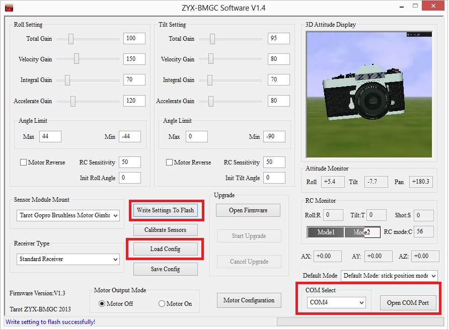 The most important setting is to set the Default Mode (just above COM port drop-down) to Default Mode: stick position mode. Select this and press Write Settings To Flash