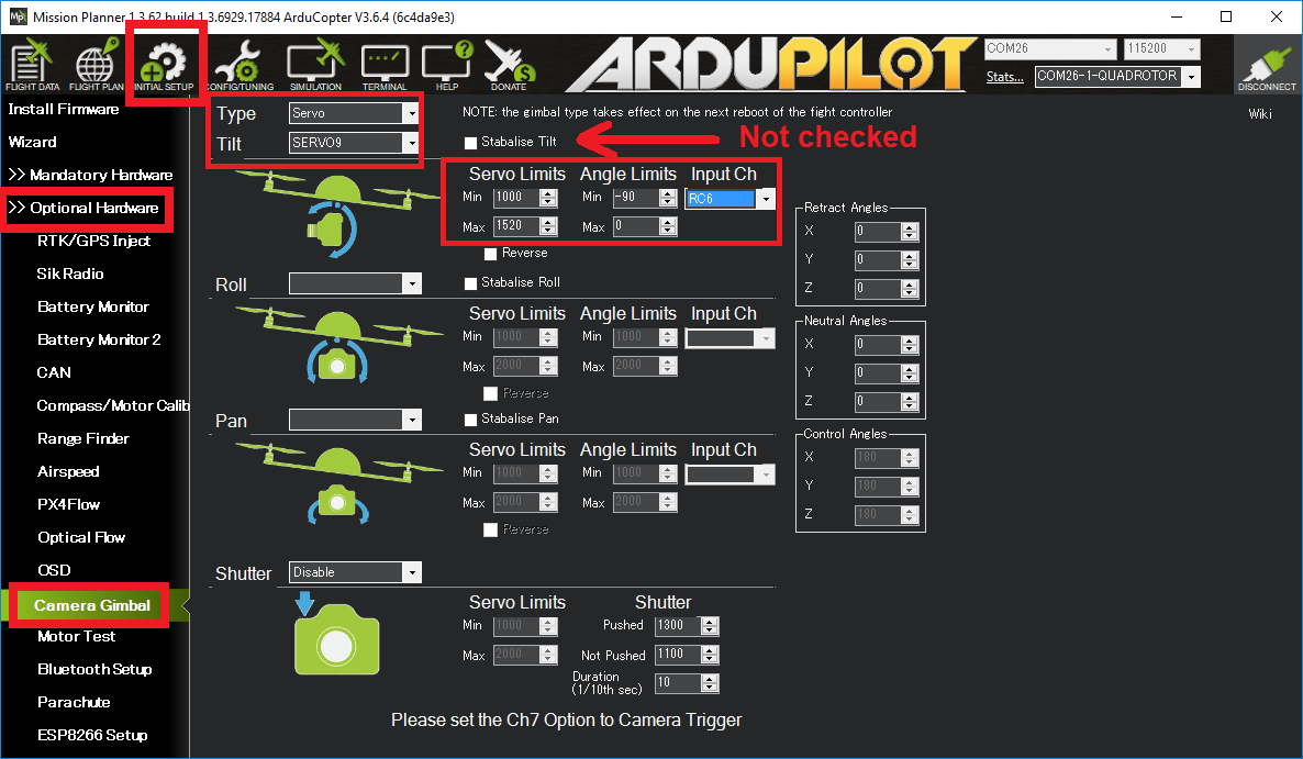 - MNT_RC_IN_TILT = 6 to specify that RC input channel 6 (normally the tuning knob) will be used to control the pitch/tilt of the gimbal