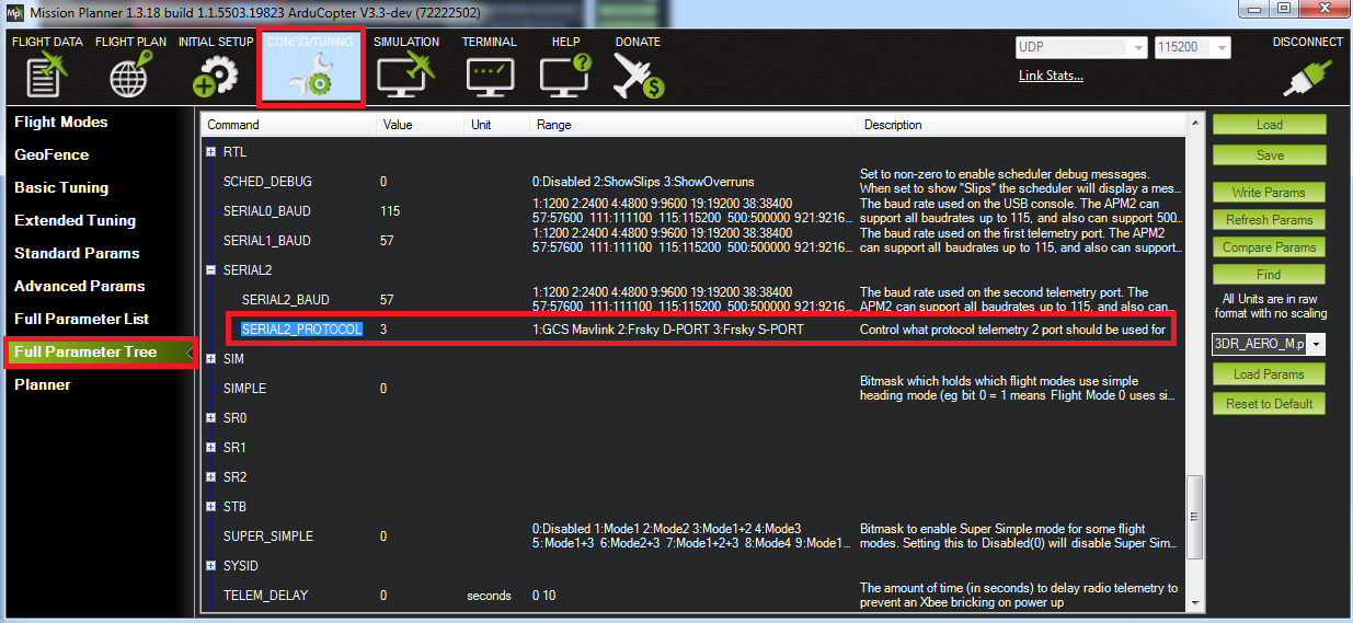 The telemetry ports can be configured through the ground station by setting the parameters listed below. If you are using the Mission Planner open the Config/Tuning | Full Parameter List page.