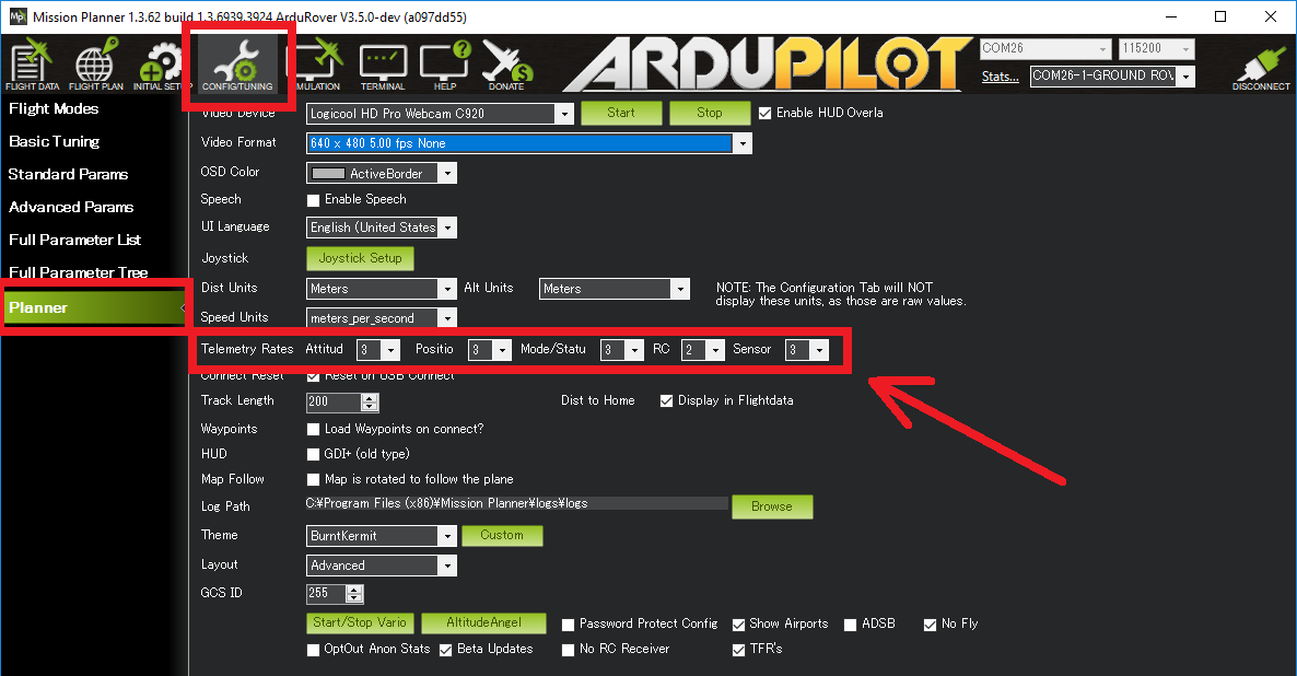 The Mission Planner’s Config/Tuning |Planner screen’s Telemetry Rates drop-downs allow a convenient way to set these parameters.