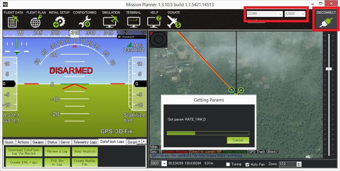 Once properly configured you should be able to connect to the vehicle from the ground station (i.e. Mission Planner) by selecting the appropriate COM port for the XBee and selecting the baud rate of 57600. If the connection is successful but the download of parameter stalls please see the notes above re CTS and RTS.