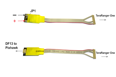 Connect the I2C Adaptor to the Pixhawk via a DF13 4S cable include into the Pixhawk box, and the TR-One to the I2C Adaptor: