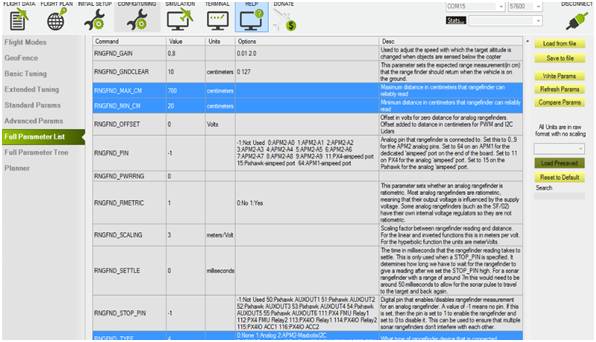To use the TeraRanger One sensor as rangefinder, connect with Mission Planner and open the Config/Tuning menu. Go into Full Parameter List section and set: