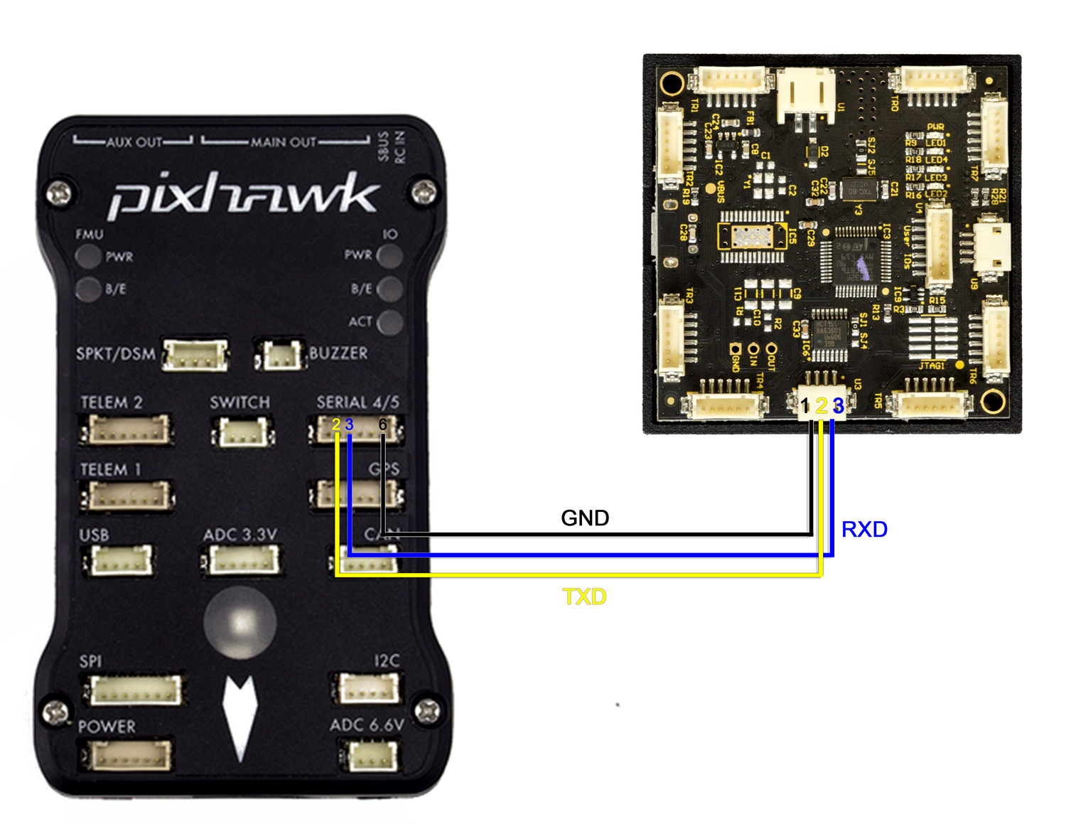 The image above shows how to connect TeraRanger Tower to Serial4 on Pixhawk. Recommended supply current is 345mA at 12V (accepted voltage range is 10-20V).
