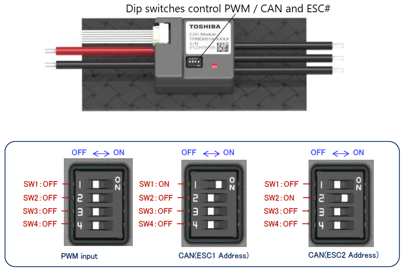 - Set the dip switches on each ESC to specify its unique number. This number also maps the ESC to an equivalent PWM output on the back of the flight controller. For example ESC 1 will react just like a normal PWM ESC connected to the flight controller’s MAIN OUT 1. By default this mapping also matches the motor order diagrams.