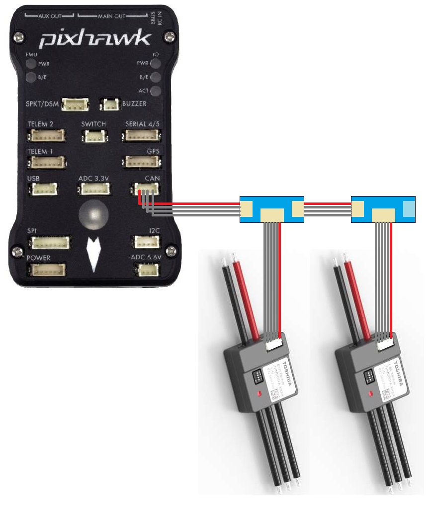 - ESCs should be daisy chained together using CAN splitter boards and then one 4-pin CAN cable should be connected to the flight controller’s CAN port. Note that the last splitter board has a terminator (i.e. no port) on one side.