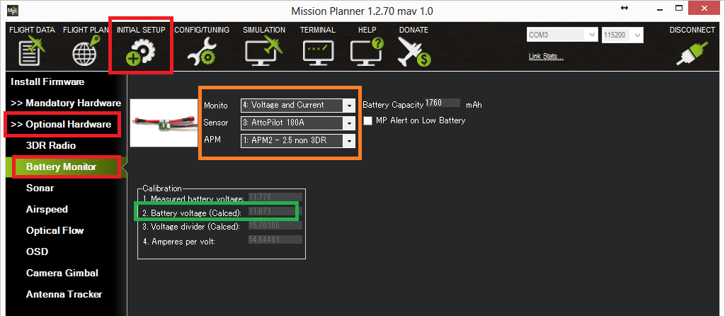 To configure the sensor go to the Mission Planner’s INITIAL SETUP > Optional Hardware > Battery Monitor page and set the “Monitor”, “Sensor” and “APM” fields as shown in the image below. If a battery is then connected you should see the “Battery voltage (Calced)” field become populated with the voltage of the battery.