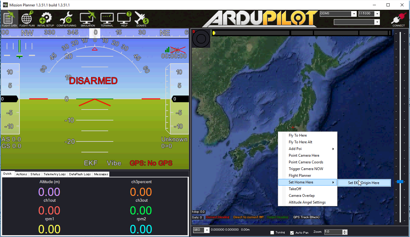 - Set the home position from the ground station map (from MP’s Flight Data screen, right-mouse-button-click on the map and select “Set EKF Origin Here”). The vehicle should appear on the map.