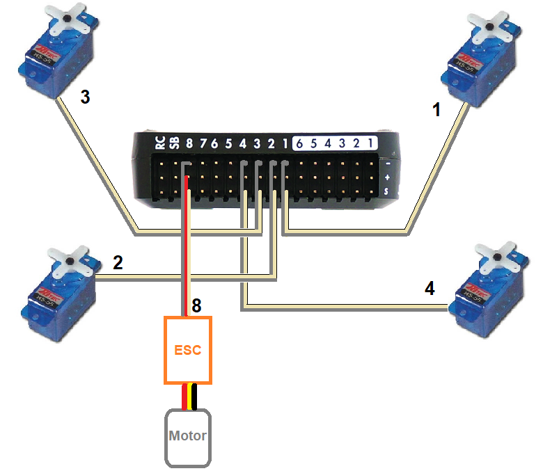 - the motor’s ESC should be connected to the flight controller’s channel 8 output