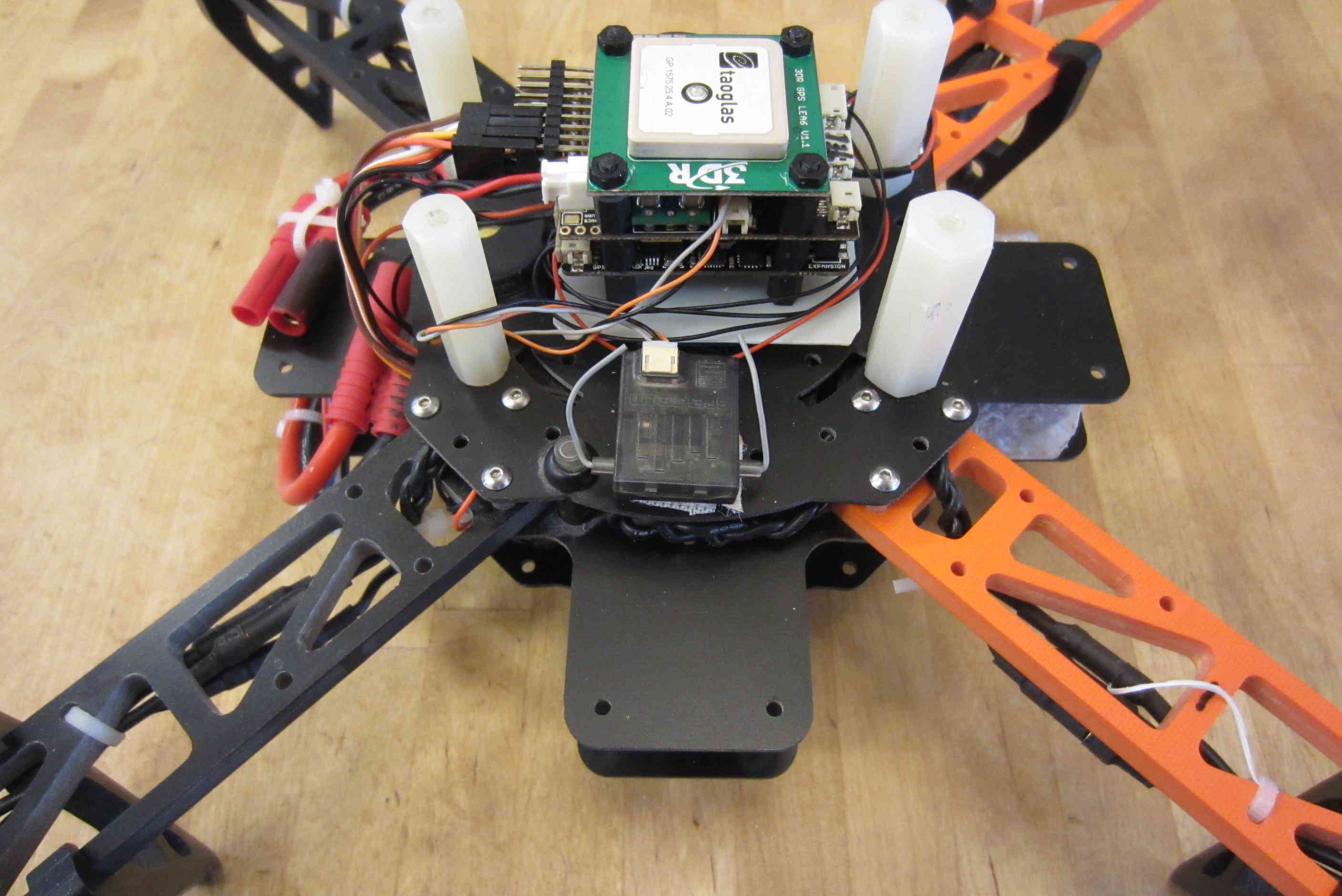 - Adhere the Pixhawk to the top of the frame with the arrow pointing to the front (between the 2 orange arms on mine).