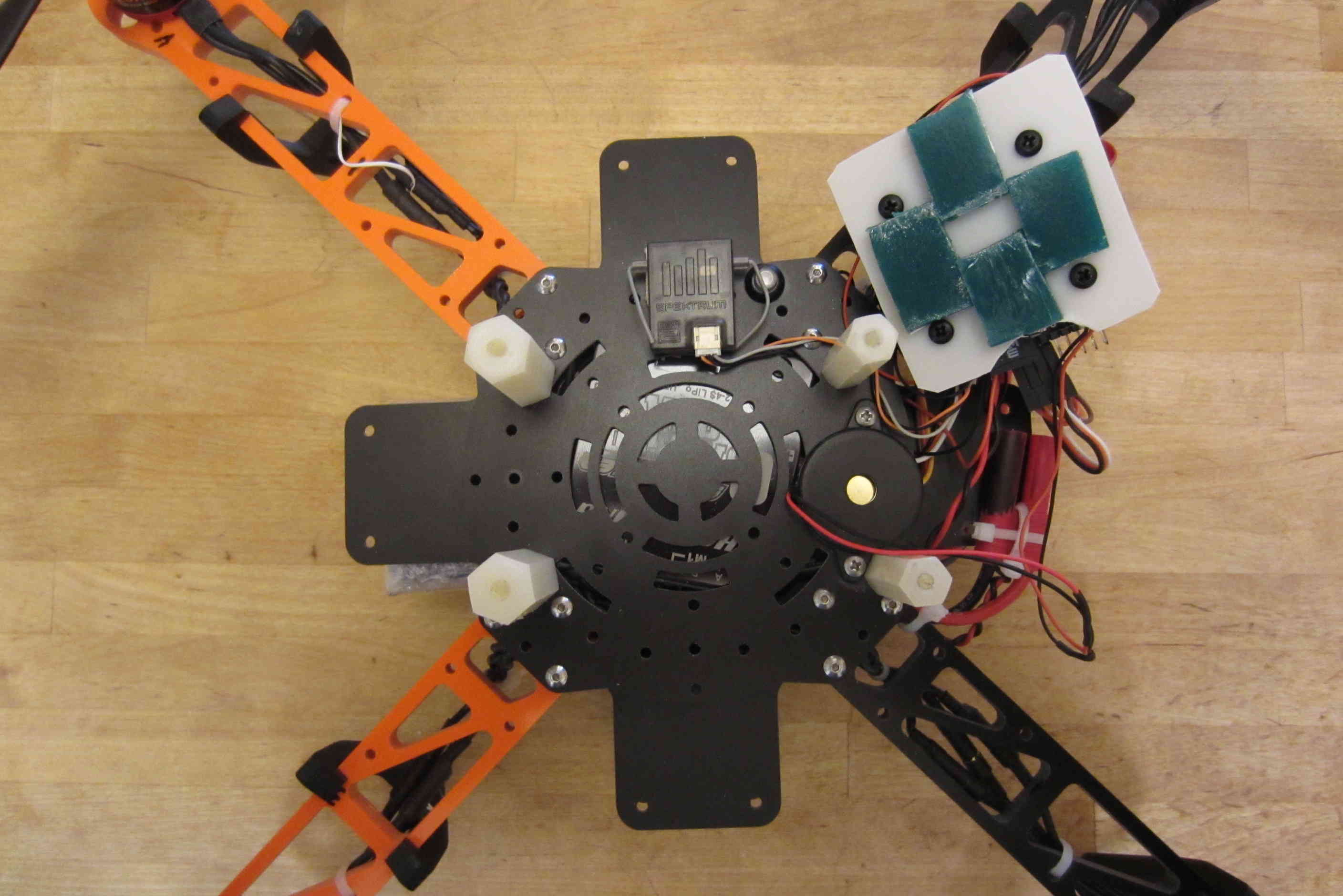 - Adhere the rectangle to the center of the top of the frame with the servo connector facing to the rear (between the black frame arms).