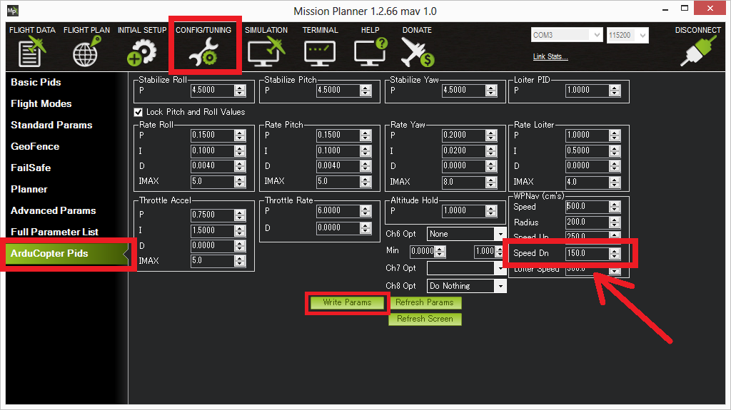 descends to 10m (or until the sonar senses something below the copter) using the regular Altitude Hold controller which will descend at the speed held in the WPNAV_SPEED_DN parameter which can be modified on the Mission Planner’s Config/Tuning > Copter Pids screen.