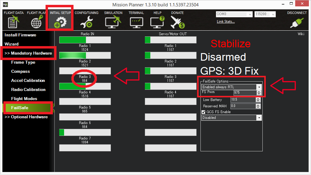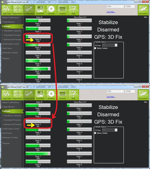 - Switch to stabilize mode, arm your motors and raise your throttle to the mid point. Turn off your transmitter. The Flight Mode should switch to RTL if you have a GPS lock or LAND if you do not have a GPS lock (the flight mode and GPS lock status are visible in the Mission Planner’s flight data screen).