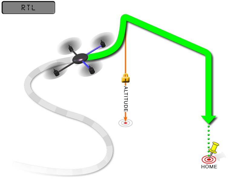 RTL mode (Return To Launch mode) navigates Copter from its current position to hover above the home position. The behavior of RTL mode can be controlled by several adjustable parameters. This page describes how to use and customize RTL mode.