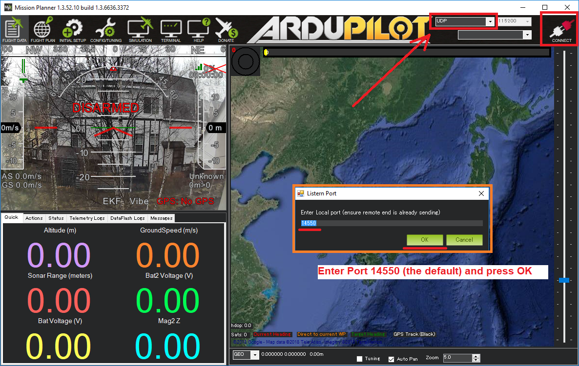 - on the ground station set the connection type to “UDP” and press connect. If asked, set the port to “14550”