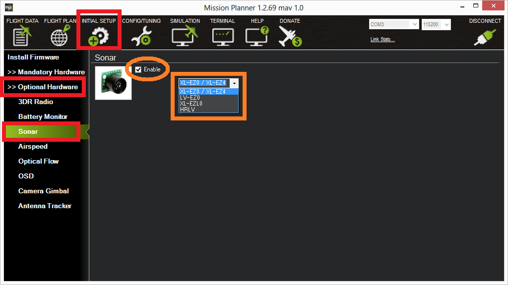 - Go to Initial Setup > Optional Hardware > Sonar