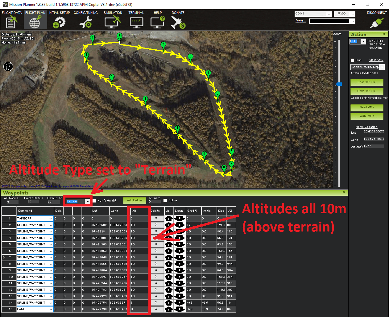 When planning missions containing commands with different altitudes-above-terrain keep in mind that the vehicle’s altitude-above-terrain will gradually change between the waypoints. I.e. it will not immediately climb or descend to the new target altitude-above-terrain as it starts towards the next waypoint.