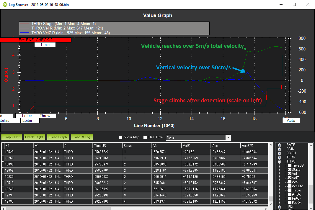 During the throw, THRO messages are written to the dataflash log. These can be useful in diagnosing problems in case the motors failed to start as part of a throw. The graph below shows a successful throw in which the overall velocity climbs above 5m/s and the vertical velocity is over 0.5m/s.