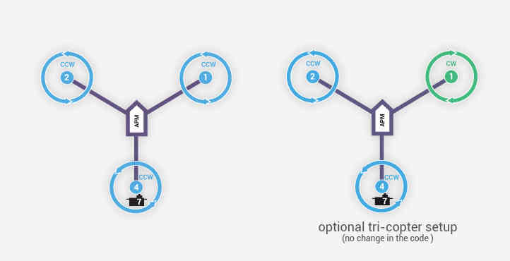 This page outlines the special settings required to get a TriCopter flying. The more general instructions for setting up a multicopter should be used for all other aspects of the setup.