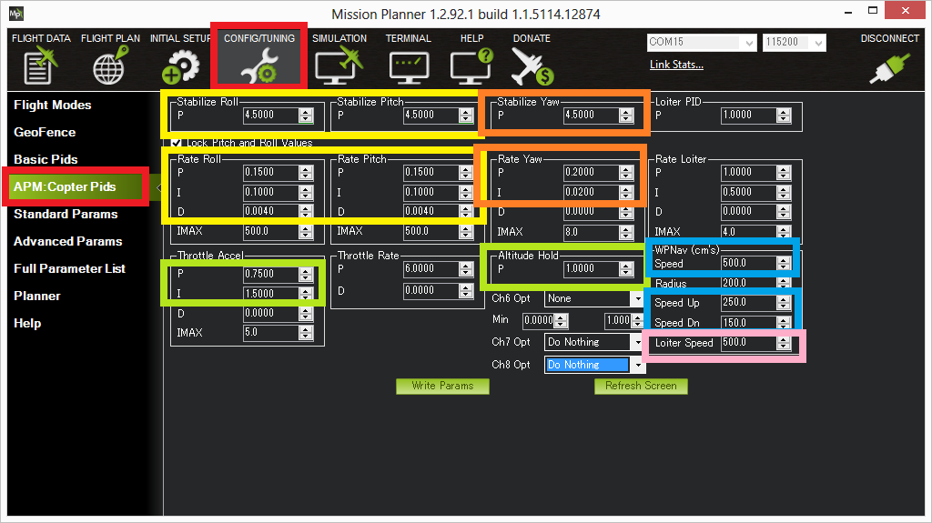 The default PID gains are meant for the 3DR IRIS although they work on a wide variety of frames. Still, to get optimal performance you may need to adjust them which can be done through the Mission Planner’s Config/Tuning | Copter Pids screen. The screen shot below shows the most important parameters for Roll/Pitch (yellow), Yaw (orange), Altitude hold (green), Loiter (pink) and Waypoint navigation (blue).