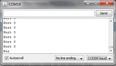 Plug your Xbee into one USB port and your APM into another. Use Arduino to load the demo code, and then in the Arduino IDE set the serial port to the one assigned to your APM board. Then open the serial monitor, setting the baud rate to 115200. You should see “Port 0” repeated as follows, showing the output from the APM’s USB port: